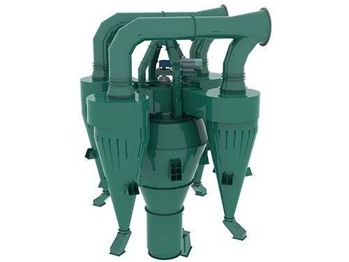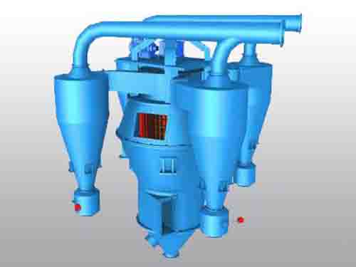 Измельченные материалы подаются в загрузочную горловину концентратора порошка и равномерно рассеиваются через вращающуюся распределяющую пластину ротора. Из-за закупорки стопорного кольца материалы будут разлетаться в зону концентрации порошка между воздушным дефлектором и ротором. Частицы порошковой пыли, которые движутся в вихре концентрации порошка, будут находиться под влиянием гравитации, силы ветра и вращательной центробежной силы одновременно, по этой причине частицы порошковой пыли с разной начальной скоростью и диаметром зерна будут иметь разное место движения, и мелкие и мелкие частицы будут всасываться внутрь ротора с воздушным потоком и попадать в циклонный коллектор четырьмя путями через комнату распределения воздуха, и большая часть конечных мелких порошков отделяется, а запыленный воздух будет выбрасываться от вытяжного канала циклонного уловителя и перейти к следующему пылеулавливающему устройству. Крупные и тяжелые частицы падают и собираются в цилиндр для сбора крупного порошка через конус и возвращаются в мельницу для повторного измельчения.